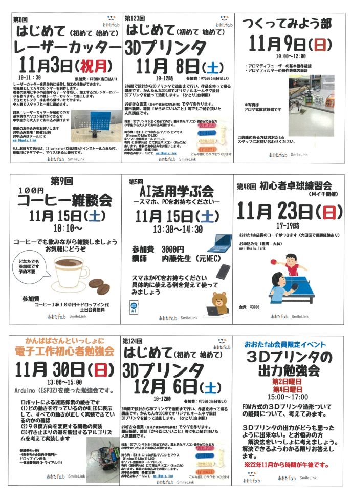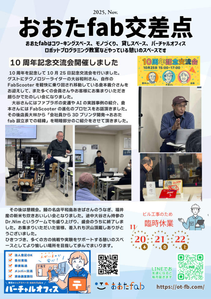 10周年を記念して10月25日記念交流会を行いました。 ゲストにテクノロジーライターの大谷和利さん、自作のFabScooterを軽快に乗り回され移動している倉本義介さんをお迎えして、 また多くの会員さんやお客様にお集まりいただき朗らかでたのしい会になりました。  大谷さんにはファブラボの変遷やAIの実践事例の紹介、倉本さんにはFabScooterの進化のプロセスをお話頂きました。その後店長大林から「会社員から3Dプリンタ開発→おおたfab設立までの経緯」を明暗部分のご紹介をさせて頂きました。
