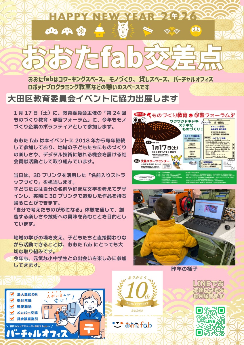 大田区教育委員会イベントに協力出展します 1月17日(土)に、教育委員会主催の「第24回 ものづくり教育・学習フォーラム」に、今年もモノづくり企業のボランティアとして参加します。 おおたfabは本イベントに2018年 … 続きを読む おおたfab交差点1月号2026