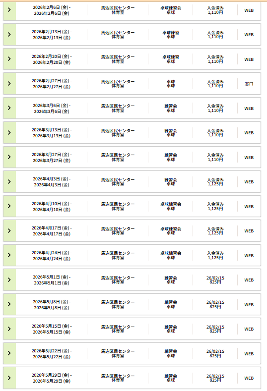 所属している大田区卓球連盟が主催している大会と、それ以外にも近隣の地域で開催される試合等にも出場しています。出場するしないは自由です。